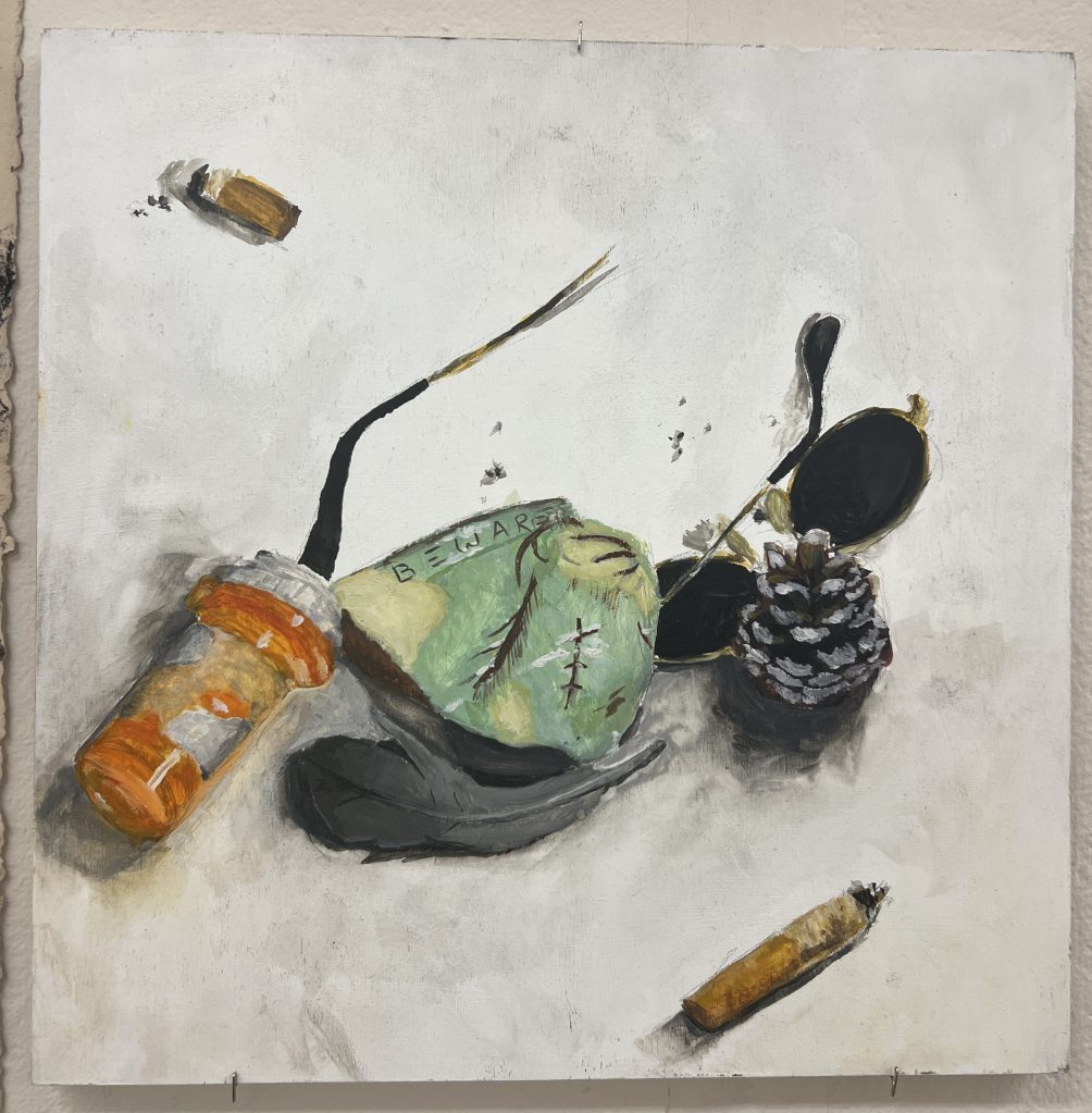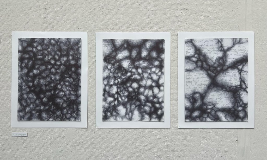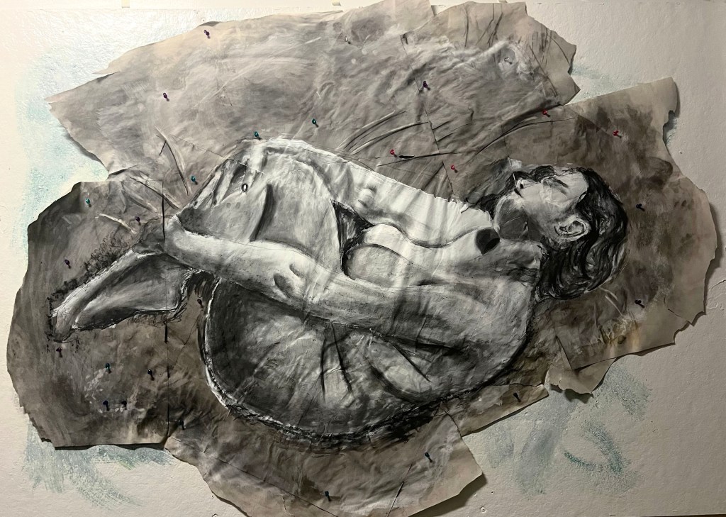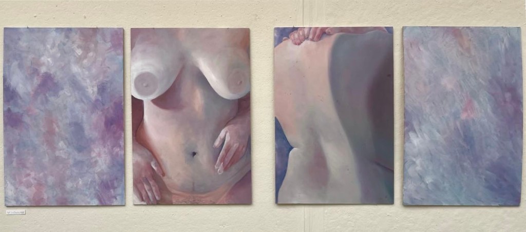 Self Portrait, charcoal on collaged ground. 42″x54″, 2023.Danger Danger. Gouache on panel. 12″x12″. 2024In the End of Things. Oil on panel. 20″x30″. 2024It, an Organism. Ballpoint pen on paper, 8″x12″. 2023That Simultaneous Wonder. Oil on panel. Each is 14″x20″. 2023