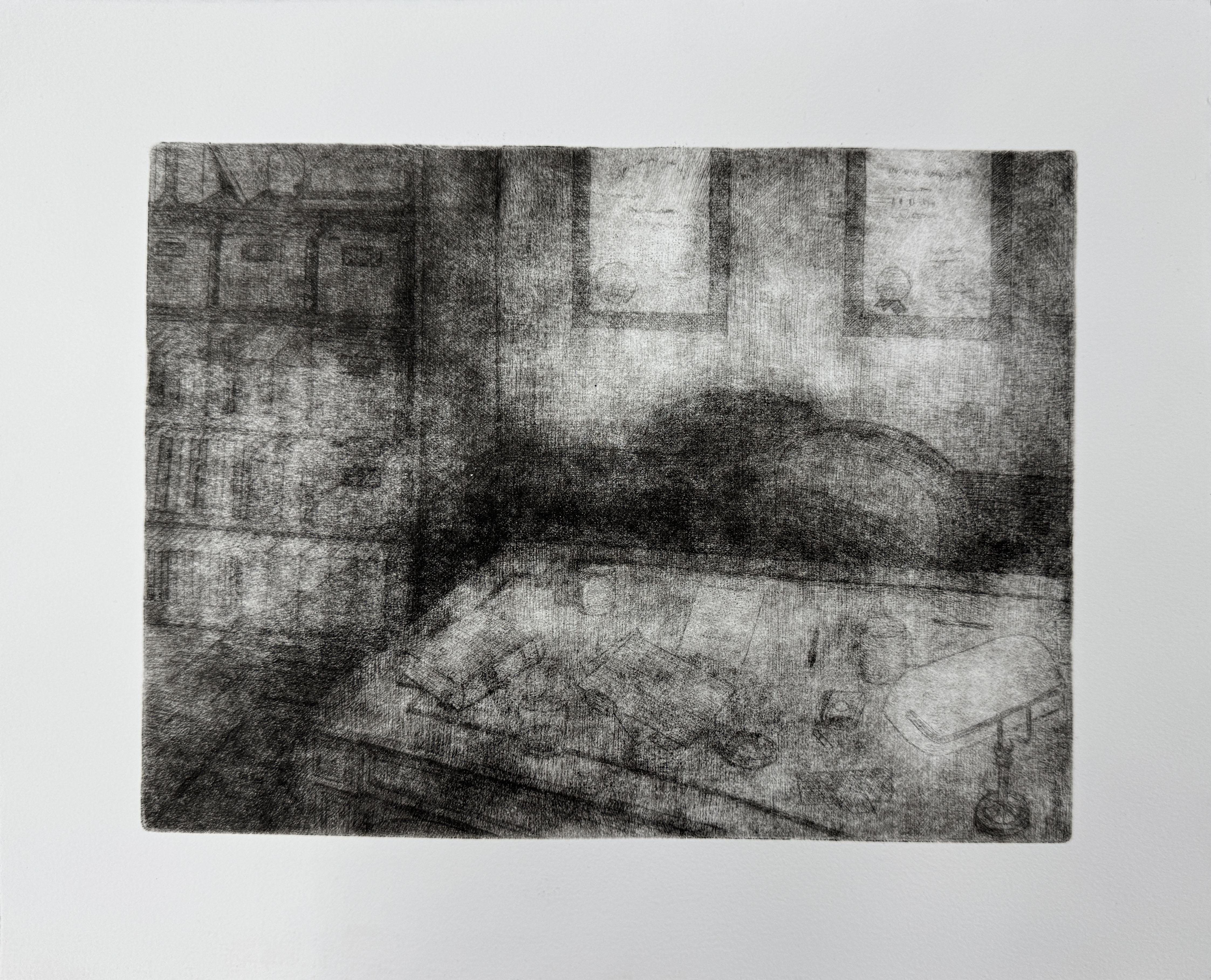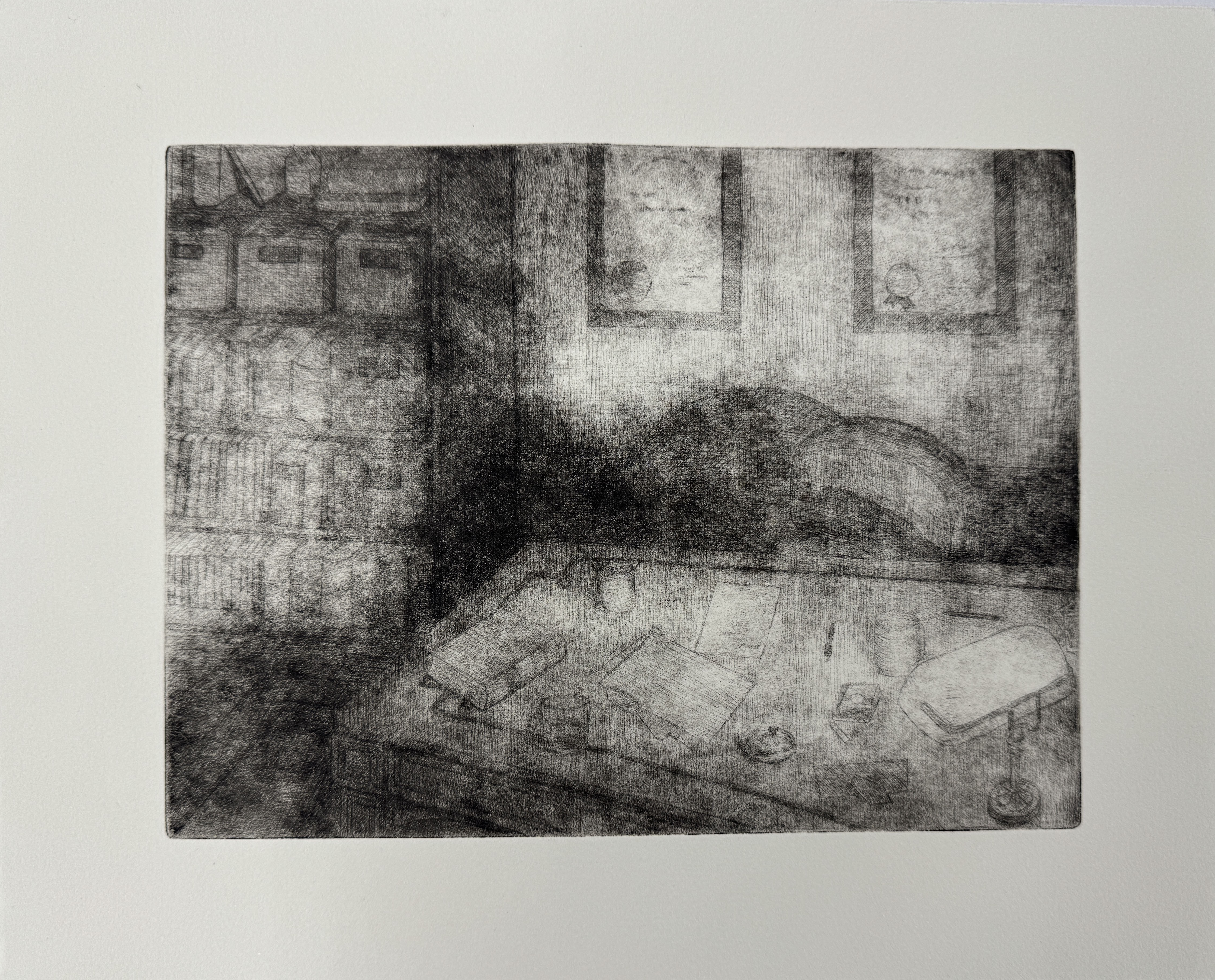 Detective’s Office, Intaglio. Two selected prints on different paper. 12″x8″2025.