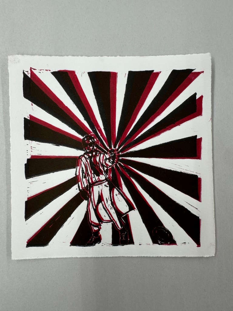 Shootout, linocut. 6″x6″